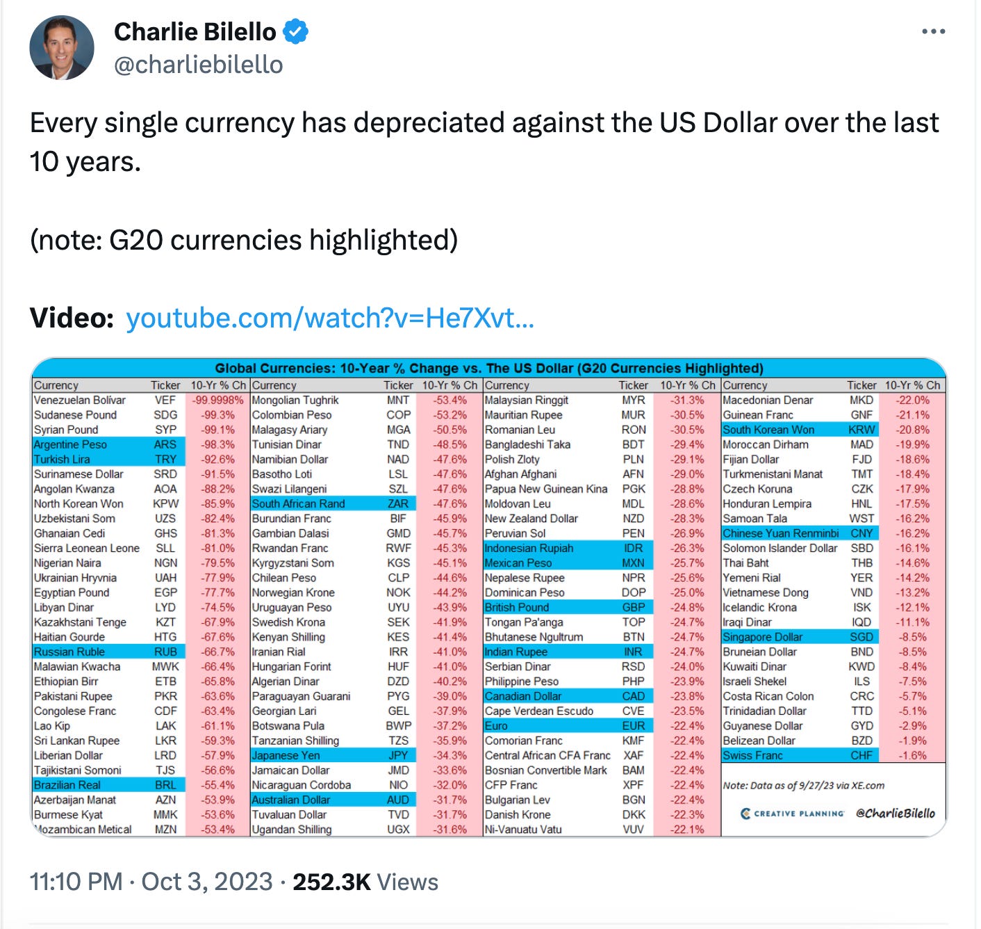 The U.S. dollar is the best of the fiat currencies, with an official policy to only lose 2% of its value per year. The rest of the world’s currencies are far worse, as seen in the chart below:
