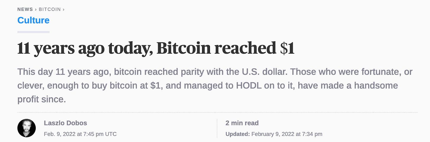 BTC 🪙 Reaches $1: February 9, 2011 (768 Days From Genesis)