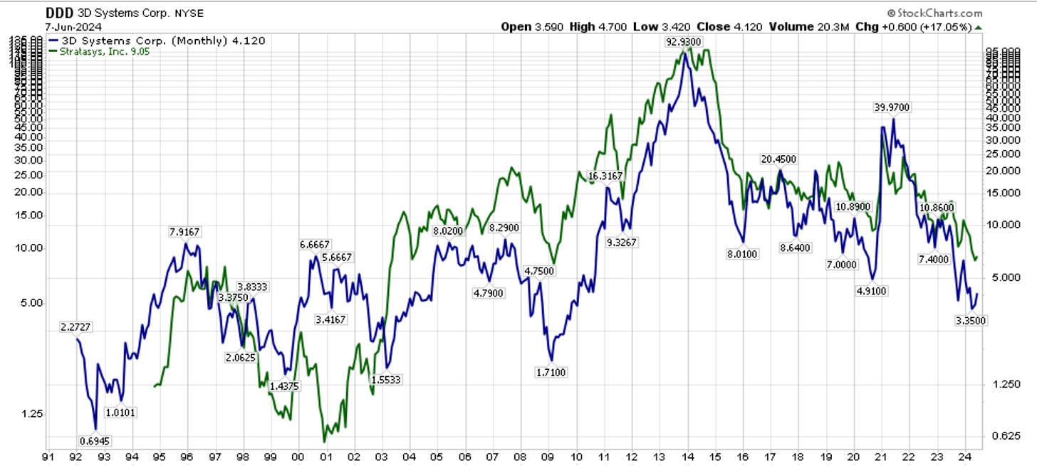 I know this just by looking at the stock price charts from the two leaders of the 3D-printing industry: 3D Systems Corporation (NYSE: DDD) and Stratasys Ltd. (Nasdaq: SSYS).