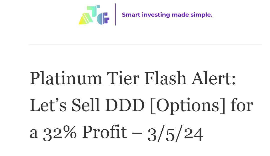 Today, members of our Platinum Tier were able to bag a profit on our 3D Systems Corporation (NYSE: DDD) options! 👇