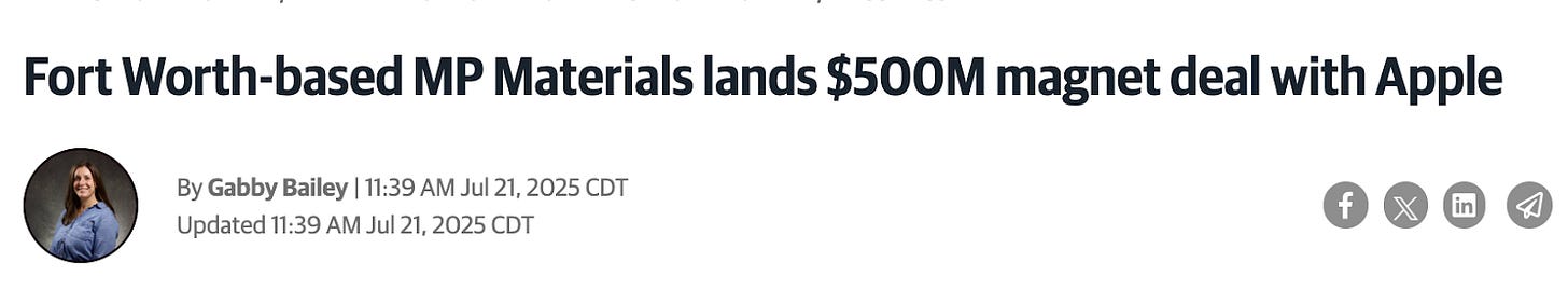 MP 0.00%โ will provide neodymium-praseodymium, a metal used to produce magnets, while AAPL 0.00%โ issued a pre-payment of $200 million!ย