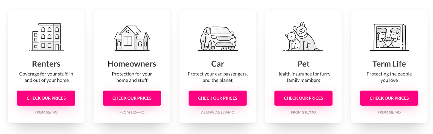 Its services include a variety of options, including renters, homeowners, pet, life, and car insurance.